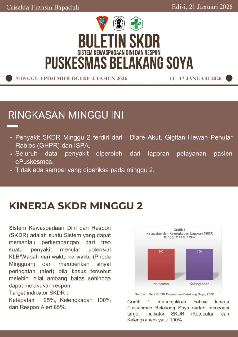 Buletin SKDR Puskesmas Belakang Soya Minggu ke-2 Tahun 2026 (11-17 Januari 2026) telah terbit.