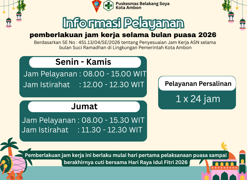 Berdasarkan Surat Edaran Nomor 451.13/04/SE/2026 tentang Penyesuaian jam kerja ASN selama bulan suci Ramadhan di ingkungan Pemerintah Kota Ambno. maka Jam pelayanan Puskesmas Belakang Soya adalah sebagai berikut: