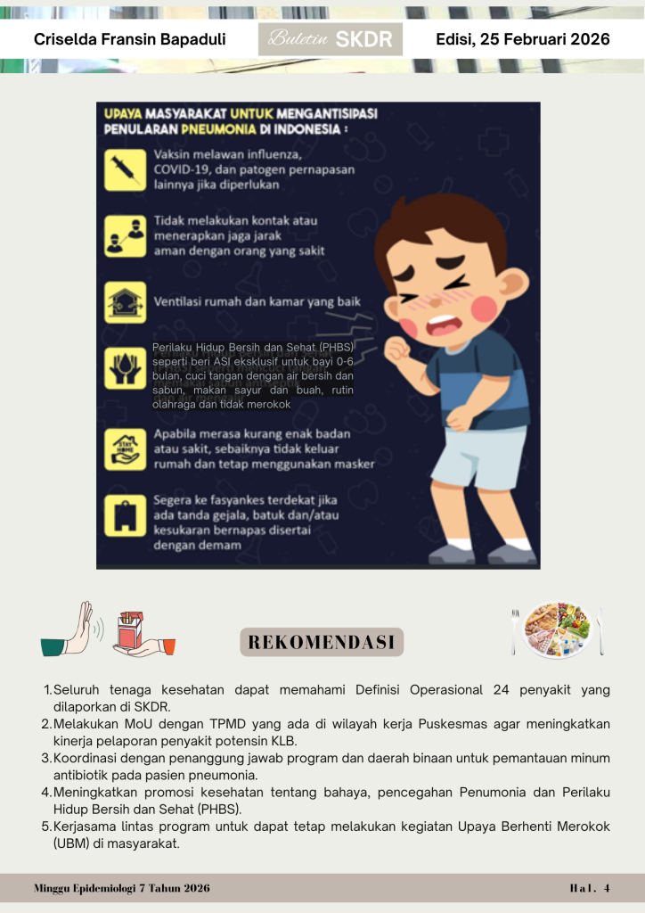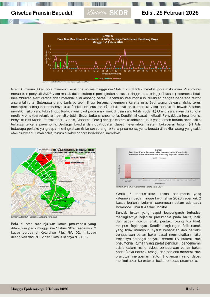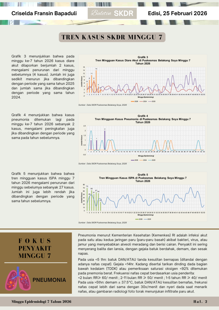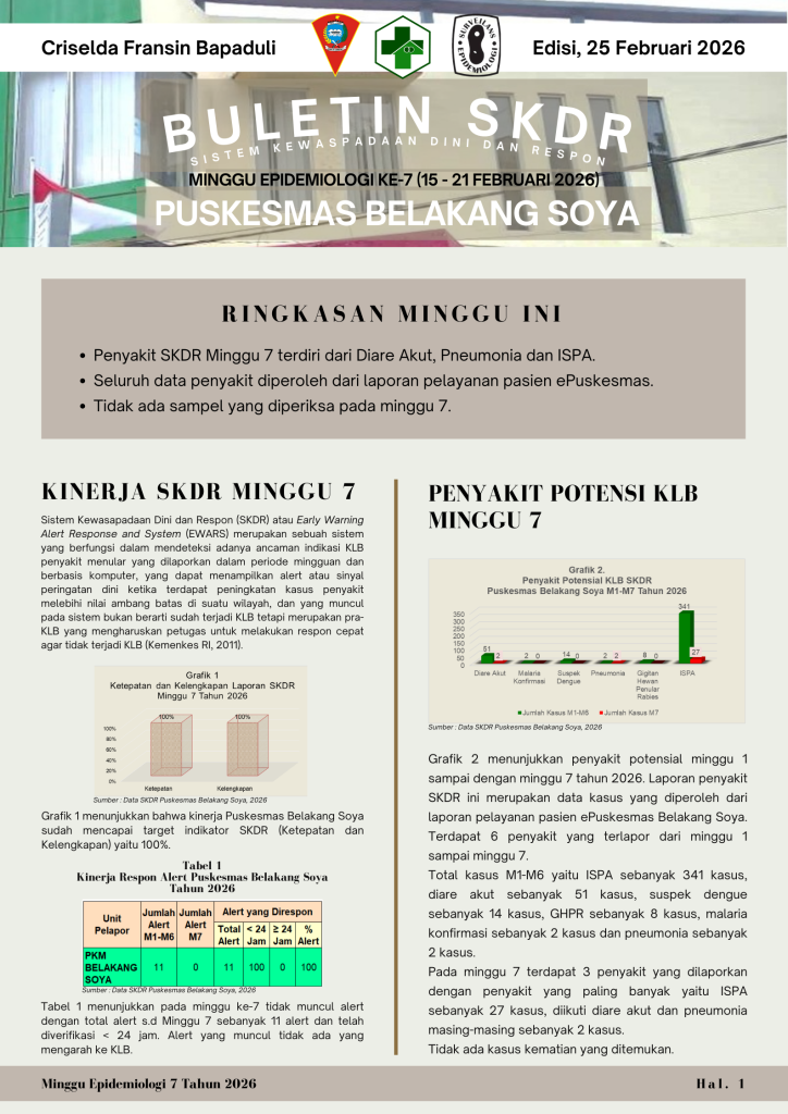 Buletin Minggu ke 7Halo basudara smua.. Buletin SKDR Puskesmas Belakang Soya Minggu ke-7 Tahun 2026 (16-21 Februari 2026) telah terbit.. Ayo simak tren penyakit menular minggu ini.. Tetap waspada, terapkan PHBS! 💪🏼 ambon2 Maret 2026Pengumuman